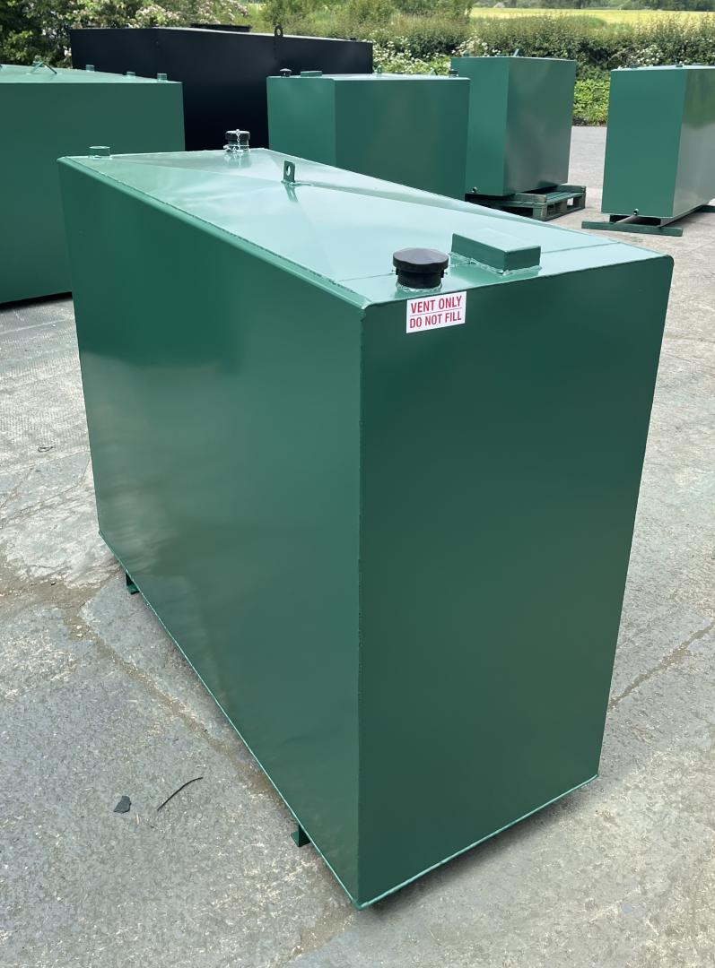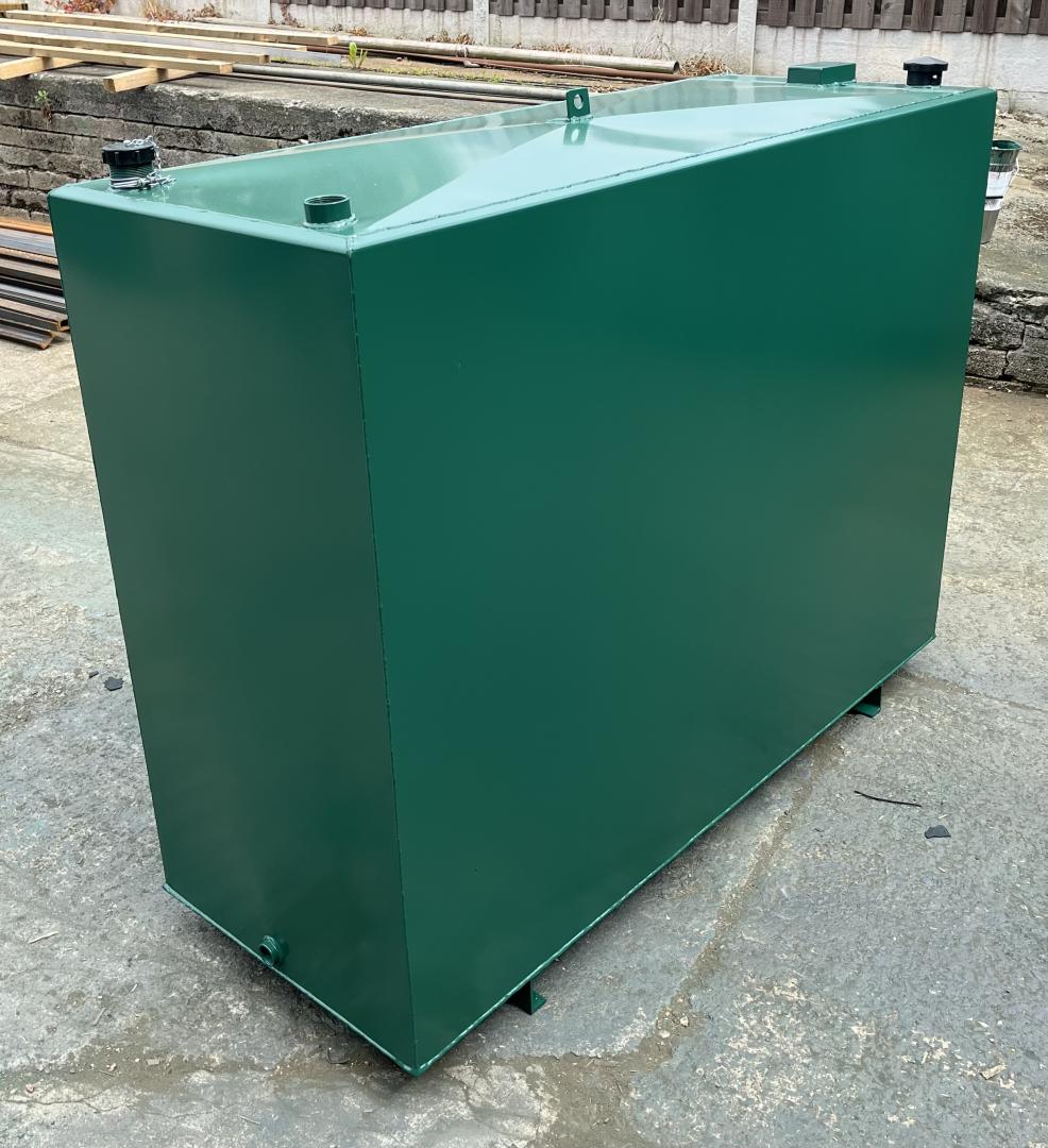 Buy direct from the manufacturer! DIMENSIONS: Length 1675mm, Width 650mm, Height 1220mm approx plus 75mm channel runners. CAPACITY: Approx 1100 Litres. WEIGHT: Approx 240 kg. PRODUCT DETAILS: Our steel bunded fuel tanks or double skinned tanks are designed for the safe storage of heating oil, diesel and gas oil, constructed to prevent spillage of their contents into the environment. They hold a minimum of 110% of the stated contents, thus ensuring the safety of the surrounding area from contamination. Manufactured to comply with UK regulations. STEEL: Our 1100 litre steel bunded oil tanks are made from 2mm inner and outer steel thickness - thicker steel available upon request at extra cost. FITTINGS INCLUDED: FREE Clock type contents gauge FREE Outlet kit including isolation valve and filter 1.5" fitting for Clock type contents gauge 2" Vent including cap, 2" Fill with cap and chain, 1" BSP Bottom Outlet, Lifting eye, Internal bracing, Channels runners (to lift the tank off the ground). PAINT: All of our tanks are sprayed with an undercoat and top coat of Holly Bush Green (RAL 14C39). Other colours are available at an extra charge, please email us the RAL code for a quote. Please note this tank does have Channel runners (to lift the tank off the ground) please see the '1100 Litre Slimline Bunded Steel Heating Oil Tank - No Channel Runners' if you do not require these. FREE STANDARD SHIPPING to mainland UK only (excluding postcodes IV, AB, HS, KW, AB, DD, FK, PH, TR, G, PA, KA, All Central London. Please complete our online contact form with your postcode and size of tank you require for a delivery quote to these areas). Free shipping is kerbside delivery only, this could be a large lorry, it is the customers responsibility to make sure there is adequate space for access and offloading. Customer is responsible for the positioning and installation of the tank. Please see the Delivery information in the terms and conditions for more details. Tanks are made to order and have a variable lead time. Our current lead-time is approximately 2/3 weeks. We will contact you by email when your tank goes in to production and again when it is sent out for delivery.